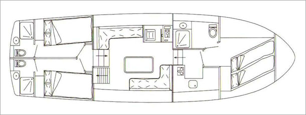 The stern houses two bedrooms with a double bed each and each with their own bathroom, fitted with a shower, toilet and washbasin. The sundeck of this boat is fitted with a fixed railing windscreen, second helm and fixed, teak-covered, seating areas. Renting and sailing this boat requires some experience.