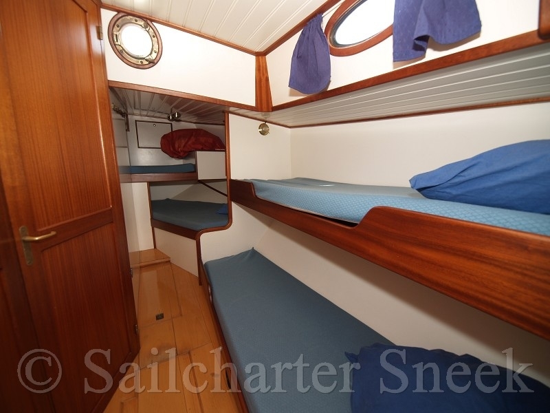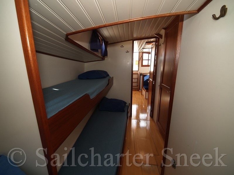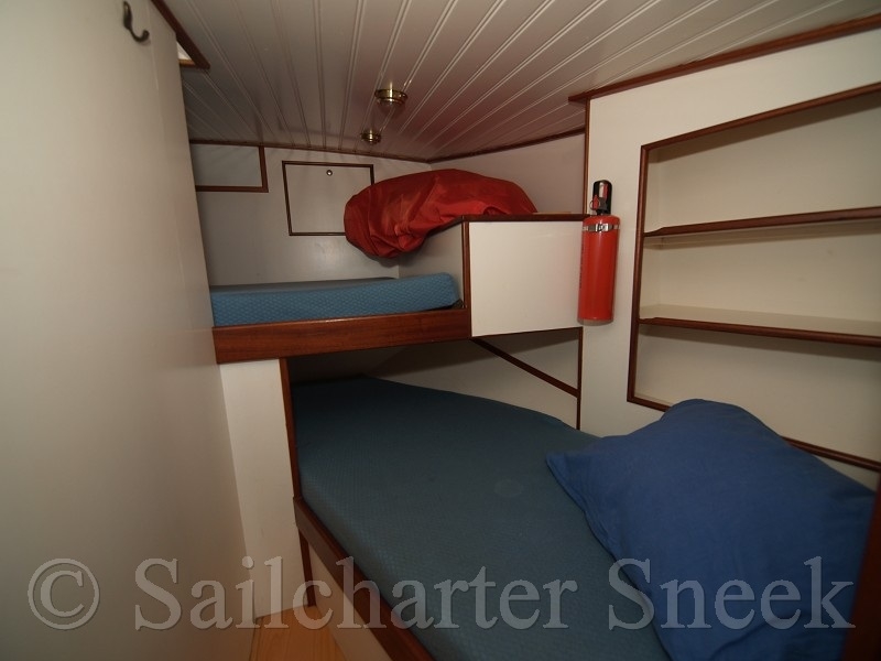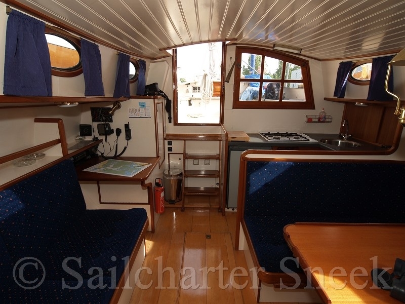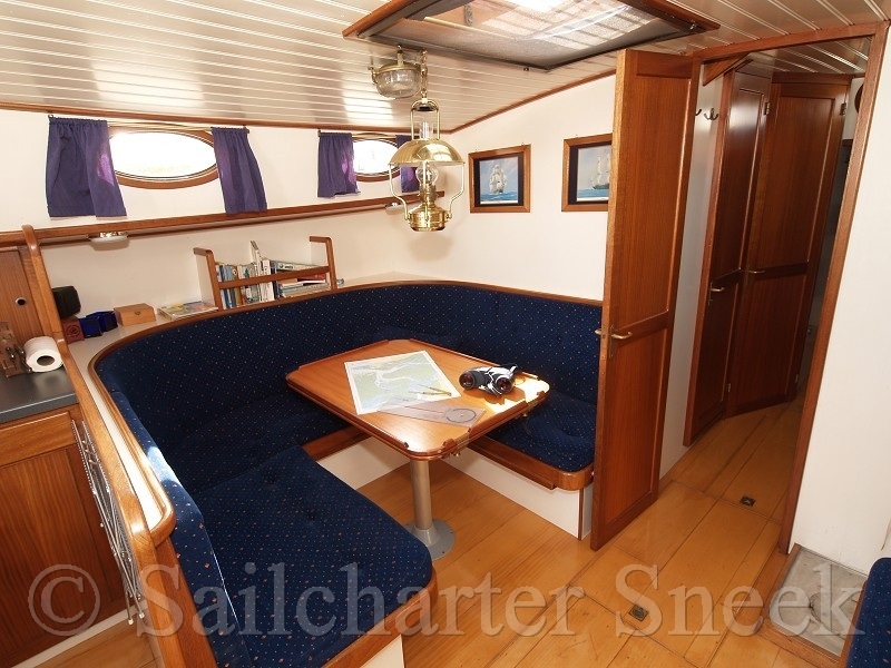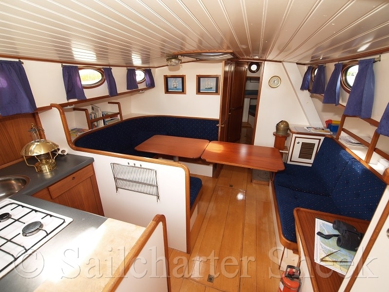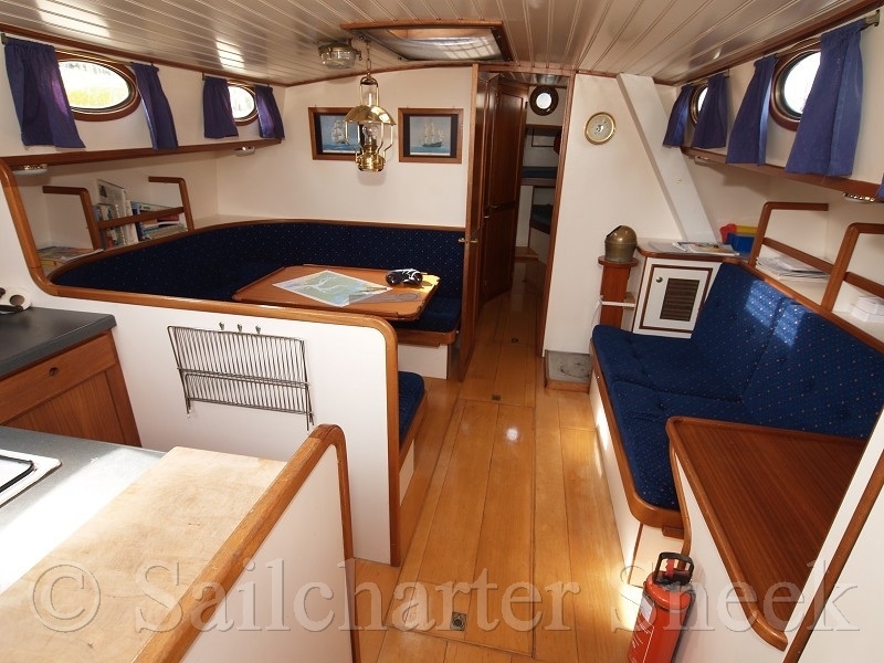 Inside its built with a bright Interieur. Both in the salon and in the cabs this Aak offers much cabinet area. Max . 9 sleep places are on board (captain cab with double bed, in the Vooronder a double bed and three single beds, in the salon can be created two further sleep places by changing of the sitting-corner ).