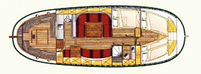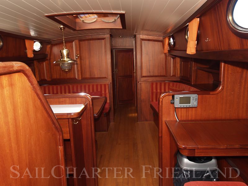 Cozy interior with sleeping accommodation for max. 9 persons, including 4 berths in the forward cabin, 2 places in the master cabin and 3 additional beds in the sitting area in the living room, a galley on port in the salon with gas stove, oven and refrigerator, bench with table.