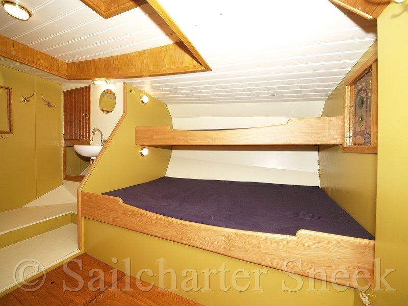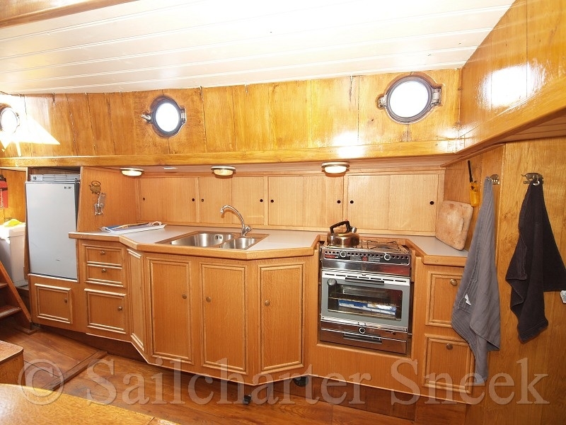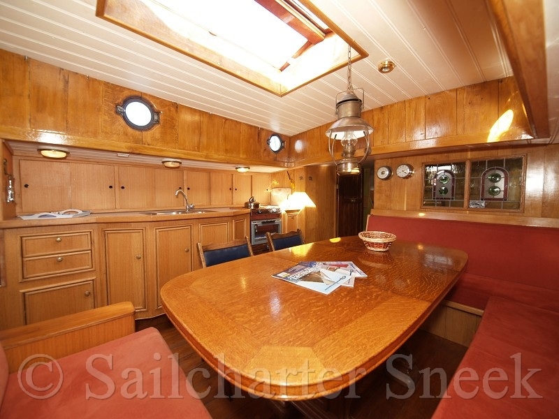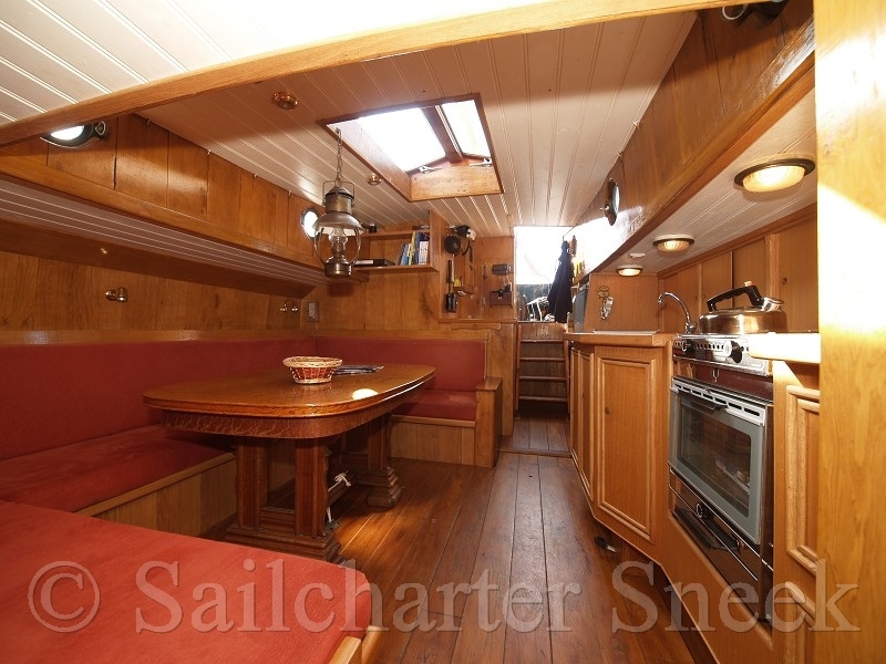 Now, the Schokland has a cozy interior with sleeping accommodations for seven people, five single and one double bunk. The beds are found in the bow. The living room with sitting area and spacious pantry with a variable table is generously placed, the galley on starboard in the salon is equipped with stove, oven and refrigerator