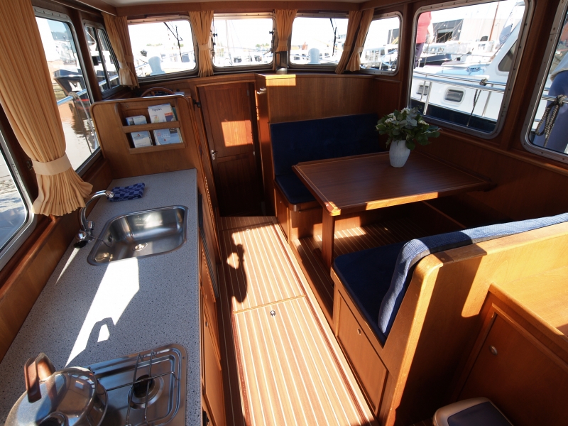In the fore you will find two single beds and a shower/toilet unit. The cosy salon with seating area, which can be easily transformed into a double bed, and a helm offers ample space to 4 persons. The large open kitchen has all the fittings including a 3-ring gas burner and a 90-litre refrigerator.