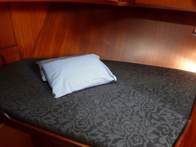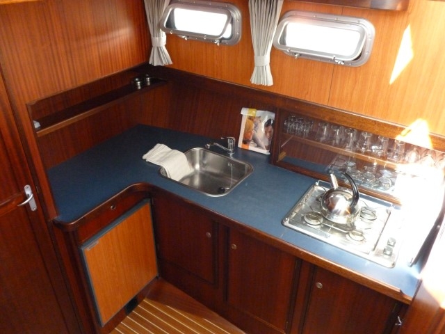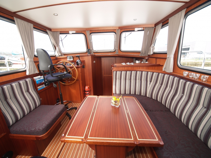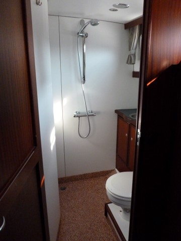 In the fore you will find a bedroom with a double bed, an en-suite shower/toilet unit. A fully-fitted large kitchen including a refrigerator and gas burner. The large salon with indoor helm is tastefully decorated, with sofas on either side.