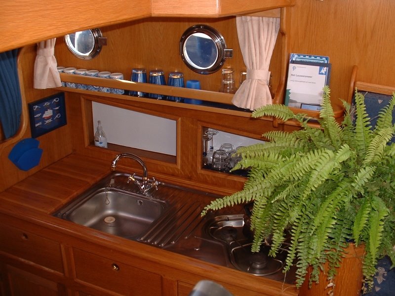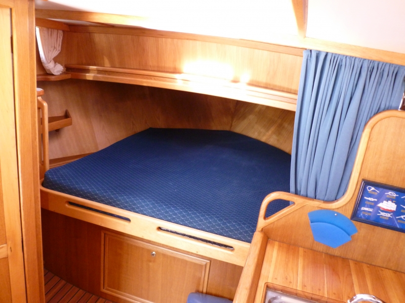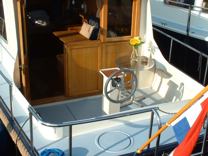 In the fore you will find a double bed and lots of storage space. The cosy salon with indoor helm is tastefully decorated and has a sofa which can easily be transformed into a double bed. The kitchen has a comprehensive inventory with arefrigerator and gas burner. Across from the kitchen is a shower/toilet unit. The generous open area has an outdoor helm and offers the possibility of sheltered recreation, even while you’re sailing.