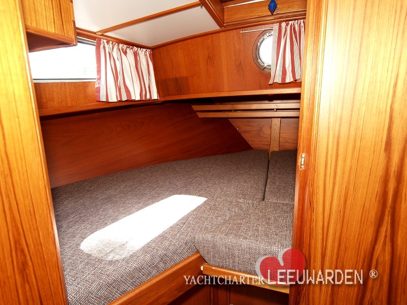In the front there is a spacious bed, which also offers place for two large people. The headroom in the saloon is 1.90 meters well. A small but fully equipped kitchen with refrigerator, gas stove is installed on the starboard side. Opposite is the toilet.