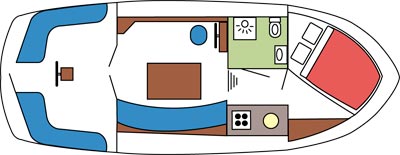 In the fore you will find two bedrooms with a double bed each. The third bedroom on this new boat is on starboard side and also has a double bed. Opposite this room there is a shower and a toilet. The kitchen, fitted with a refrigerator and gas burner, was built in a U-shape at the same level as the spacious salon, from where you have easy access to the spacious open area through the folding doors.